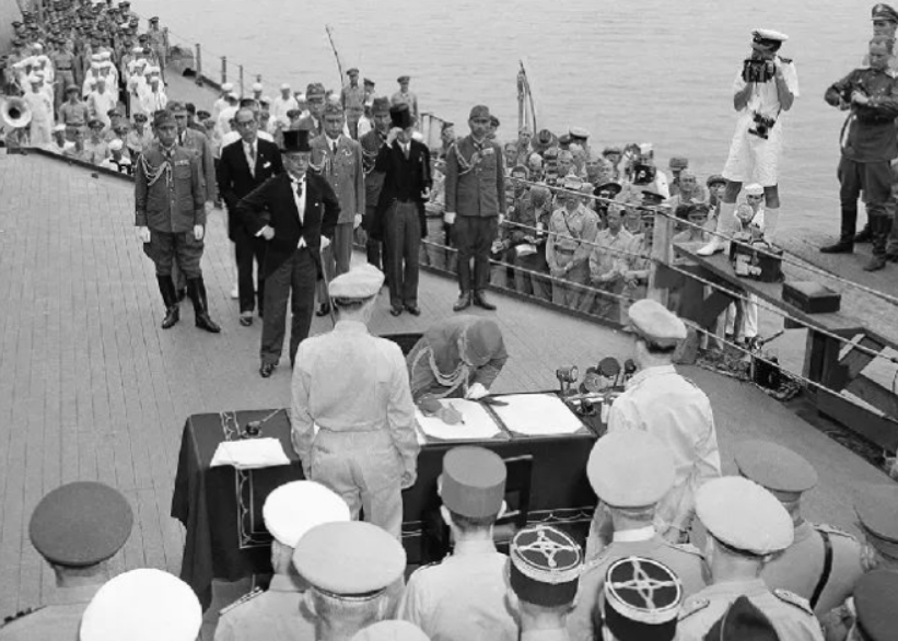 1945年9月2日,日本政府代表在美軍“密蘇里”號軍艦上簽署無條件投降書。